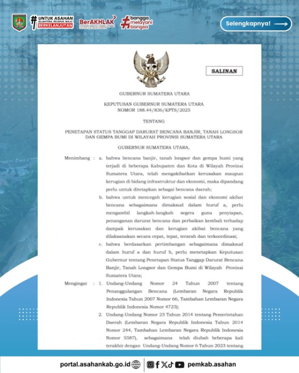 “Terkait kebijakan tersebut, Pemkab Asahan terus memperkuat koordinasi lintas sektor dengan BPBD, Dinas Sosial, Dinas Kesehatan, kecamatan, puskesmas, serta unsur TNI–Polri untuk memastikan penanganan cepat pada wilayah-wilayah terdampak maupun rawan bencana,” ujar Kepala Dinas Kominfo Kabupaten Asahan Jutawan Sinaga S.STP, MAP melalui Kepala Bidang Komunikasi Media Arief Budiman Hutasuhut SH dalam keterangan persnya, Senin (01/12/2025).
