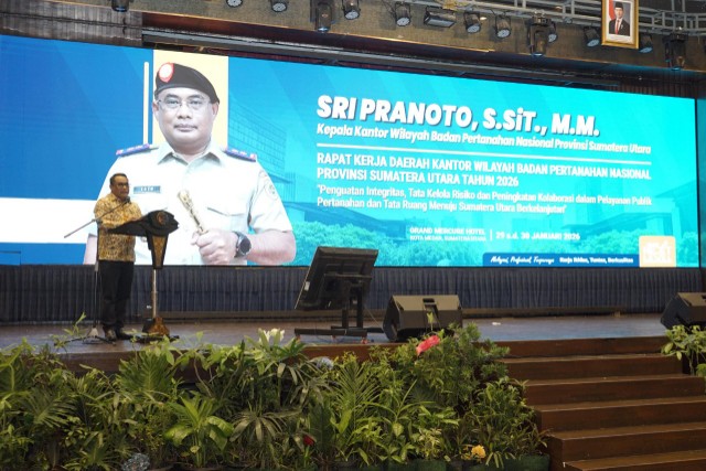 Medan, buanapagi.com – Kepala Kantor Wilayah Badan Pertanahan Nasional (BPN) Provinsi Sumatera Utara menegaskan bahwa Rapat Kerja Daerah (RAKERDA) Tahun 2026 tidak boleh berhenti pada tataran formalitas semata. Hal tersebut disampaikannya dalam sambutan pada pembukaan RAKERDA Tahun 2026 yang digelar pada Hari Kamis, 29 Januari 2026 di Hotel Grand Mercure Medan dengan mengusung tema “Penguatan Integritas, Tata Kelola Risiko & Peningkatan Kolaborasi Pelayanan Publik Menuju Sumatera Utara Berkelanjutan.”