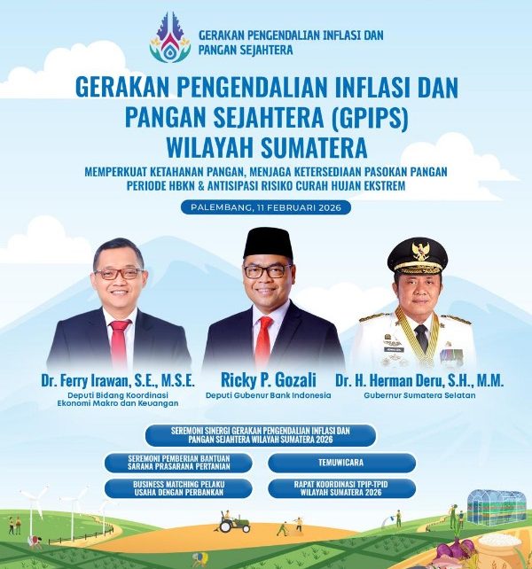 Palembang, buanapagi.com — Tim Pengendalian Inflasi Pusat (TPIP) bersama Tim Pengendalian Inflasi Daerah (TPID) Wilayah Sumatera akan menyelenggarakan rangkaian kegiatan Gerakan Pengendalian Inflasi dan Pangan Sejahtera (GPIPS) serta Rapat Koordinasi (Rakor) TPIP–TPID di Palembang pada 11 Februari 2026.