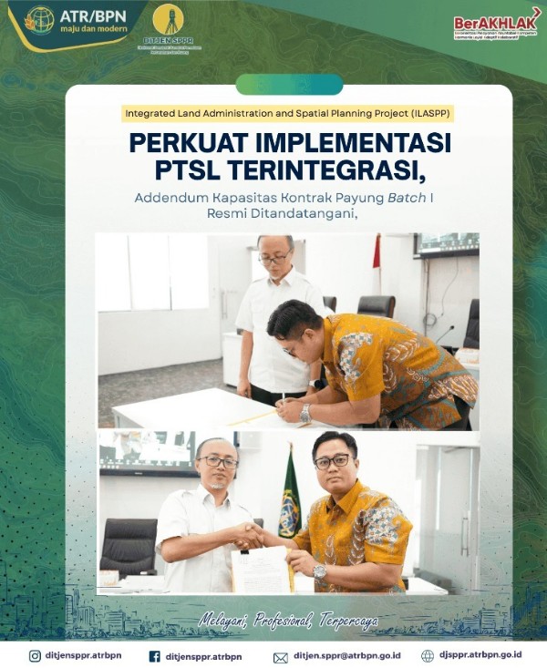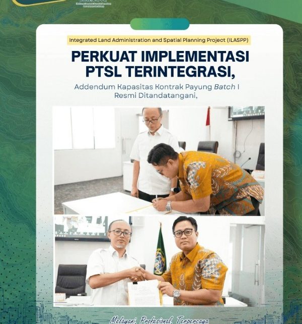 Jakarta, buanapagi.com – Kementerian Agraria dan Tata Ruang/Badan Pertanahan Nasional (ATR/BPN) melaksanakan Pengarahan dan Penandatanganan Adendum Penambahan Kapasitas Kontrak Payung Pendaftaran Tanah Sistematis Lengkap (PTSL) Terintegrasi. Agenda ini dilaksanakan dalam rangka pelaksanaan kegiatan Pengukuran, Pemetaan, dan Informasi Bidang Tanah PTSL Terintegrasi dengan sumber dana Pinjaman dan/atau Hibah Luar Negeri (PHLN) pada Integrated Land Administration and Spatial Planning Project (ILASPP).